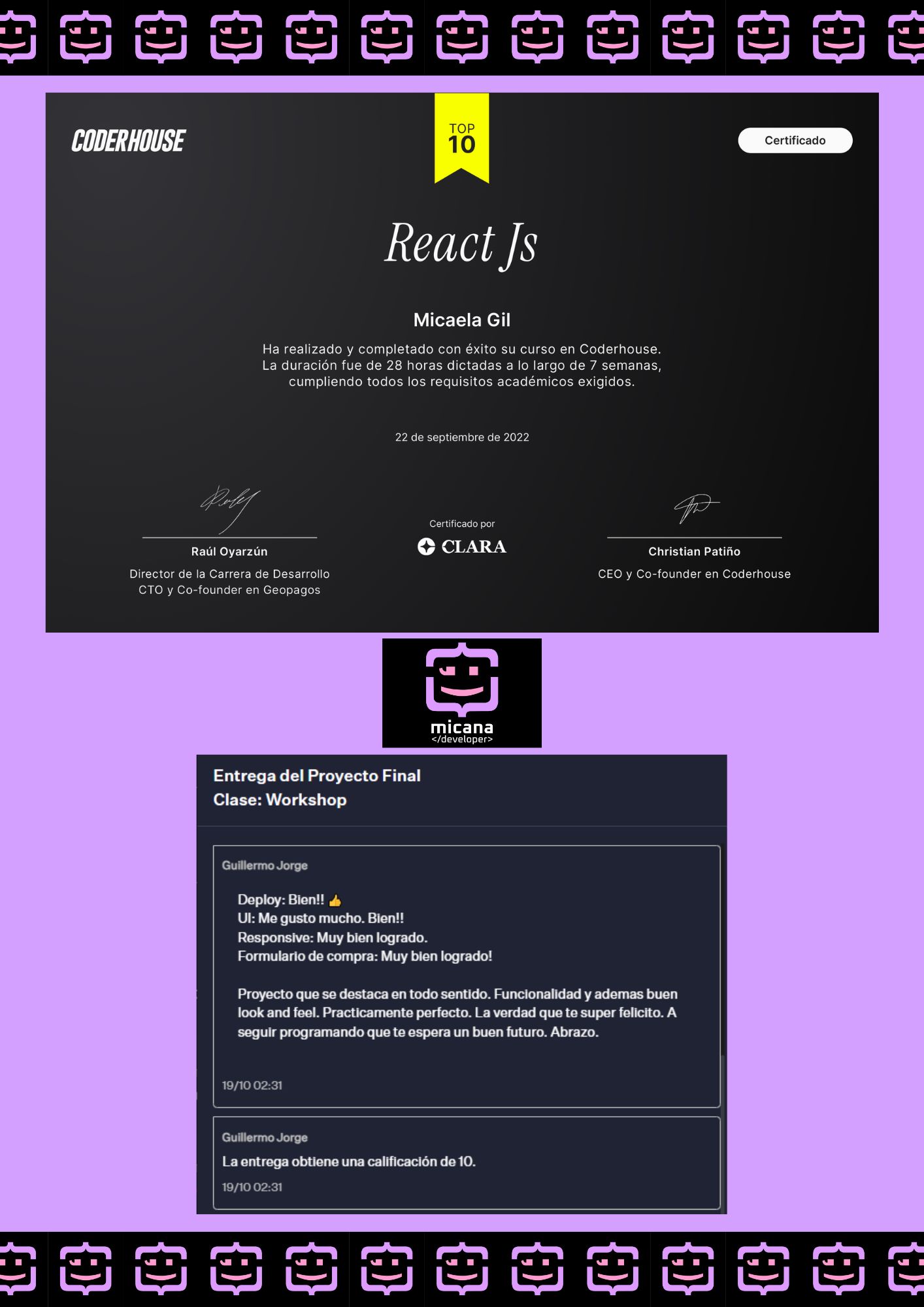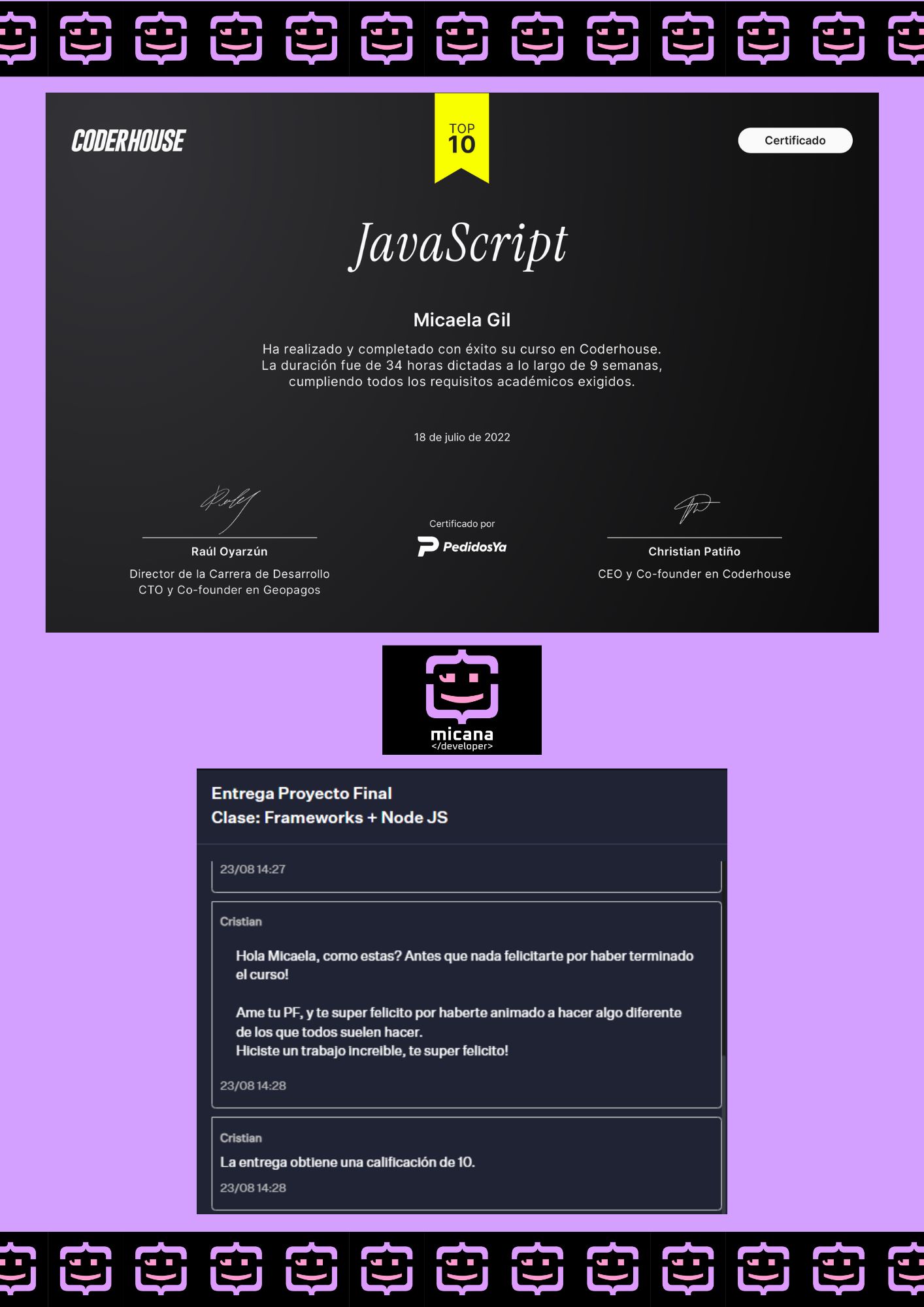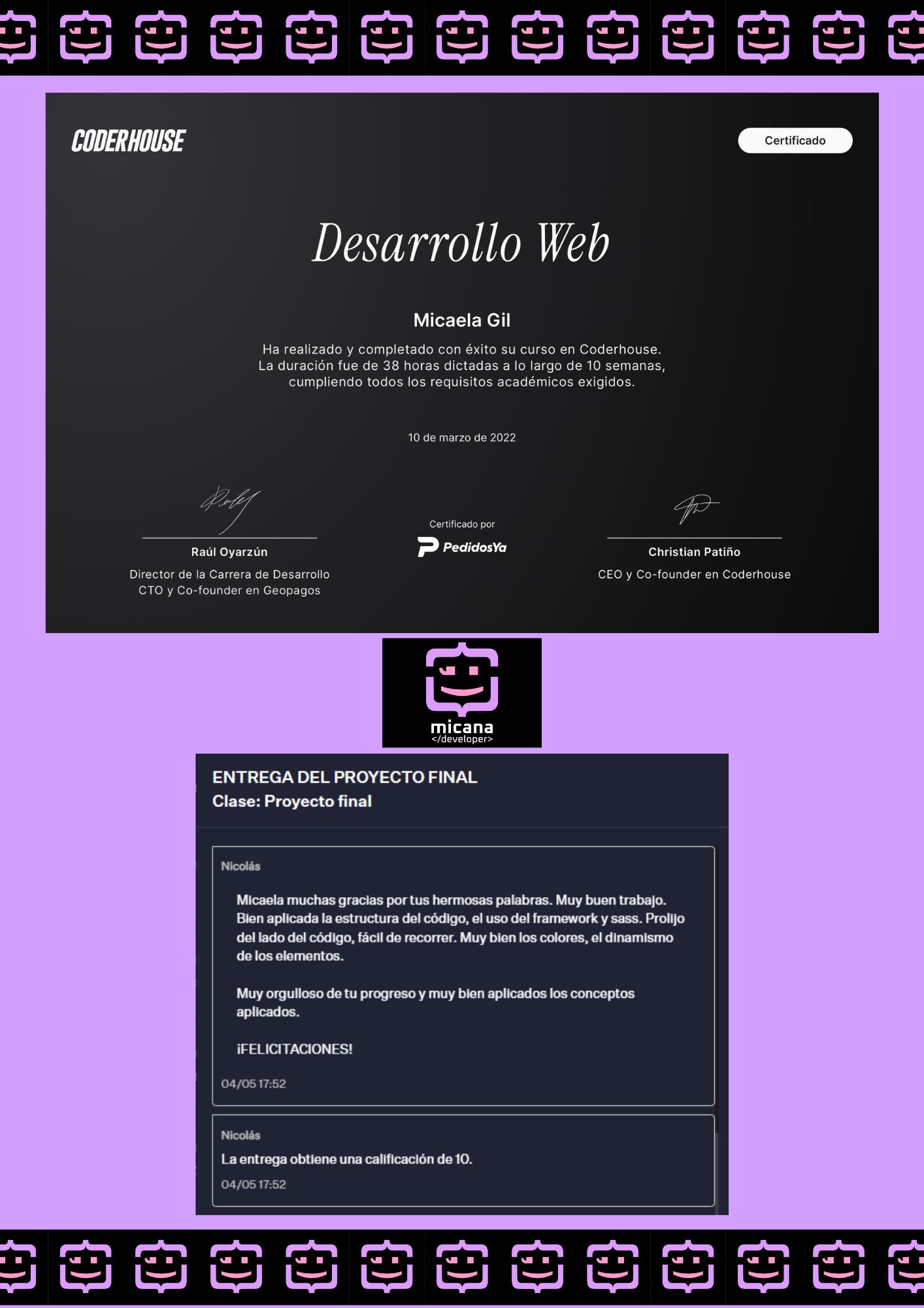 "¡Hola! Soy Micaela Naiara Gil, una apasionada desarrolladora web creativa en soluciones digitales elegantes y funcionales. Me especializo en diseñar y desarrollar sitios web que no solo se ven increíbles, sino que también ofrecen una experiencia de usuario fluida y accesible. Mi enfoque se basa en la creatividad, la innovación y las mejores prácticas de desarrollo, asegurando que cada proyecto sea único y esté optimizado para el futuro. ¡Explora mi trabajo y acompáñame en este viaje digital!"